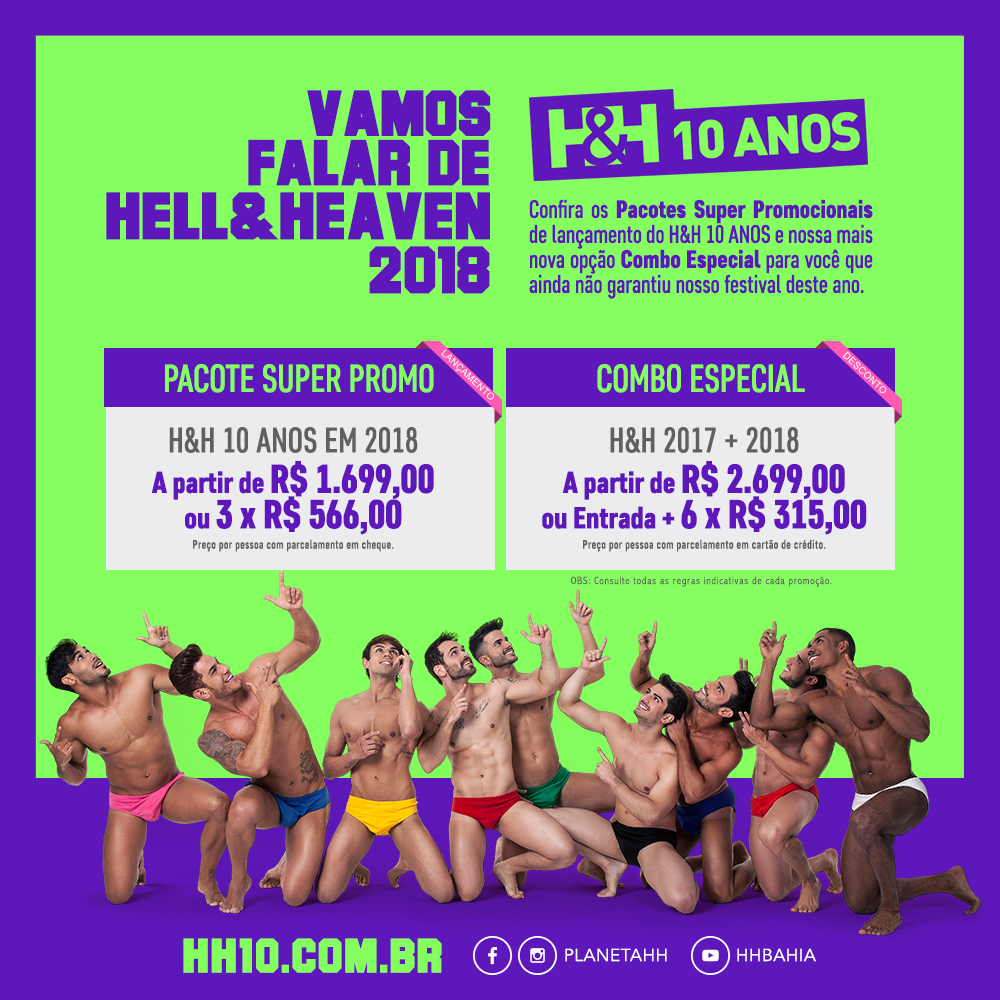 Eu sempre brinco que TODOS OS ANOS nossos passageiros frequentes compram uma CAIXA SURPRESA... eles não sabem o que tem dentro mas confiam na qualidade e no conteúdo que a H&H sempre proporcionou ao longo de seus 10 anos de história! Falando em história, antes de mais nada gostaria de agradecer de coração por ter você conosco construindo essa trajetória de sucesso de um festival que nasceu com o único objetivo de trazer entretenimento e turismo de qualidade para o público GAY no Brasil! Vamos então começar a falar do HELL & HEAVEN em 2018! Objetivando sempre um MELHOR atendimento, já que nossas vendas promocionais no ano passado se esgotaram em menos de uma semana, decidimos lançar nossa edição especial com muita antecedência visando sempre VOCÊ que é muito mais do que um CLIENTE para nós! Ainda mais em um ano tão especial com uma GRANDE Edição Comemorativa de ANIVERSÁRIO deste que se transformou no MAIS AGUARDADO festival, REFERÊNCIA na América Latina, atraindo todos os anos um público de literalmente TODOS os estados do Brasil e de diversas cidades do exterior... muitas HISTÓRIAS em dias MÁGICOS nos aguardam! Estamos guardando secretamente a data e o local de nossa grande edição do H&H 10 ANOS em 2018 que será anunciada somente em Novembro deste ano conjuntamente com o início das vendas dos demais Pacotes do festival. Enquanto isso, confira os Pacotes SUPER PROMO de pré-lançamento, exclusivamente para quem já garantiu o H&H Bahia 2017 (a partir de R$ 1.699,00 ou 3 x R$ 566,00 por pessoa com parcelamento em cheque) e a mais nova opção COMBO especial, para você que ainda não garantiu nosso festival deste ano (a partir de R$ 2.699,00 ou ENTRADA + 6 x R$ 315,00 por pessoa com parcelamento em cartão de crédito)! Confira todas as regras indicativas de cada um destes Pacotes Promocionais e siga o passo-a-passo para realizar a sua PRÉ-RESERVA em nosso novo site do H&H 10 ANOS: 1. A única forma de realizar sua RESERVA é por meio do novo Formulário de Reserva Online de nosso site oficial (http://www.hh10.com.br/reserva/) tanto para as vendas diretas, quanto para as vendas via Parceiros, Embaixadores ou Agências. 2. Todas as reservas efetuadas já estarão em ORDEM DE CHEGADA em nosso sistema de atendimento que possui um prazo de 48hs para confirmação e pagamento. Caso sua reserva não cumpra o prazo estabelecido, ela passará automaticamente para o final da fila. Caso haja Lista de Espera, esta será também priorizada por meio da ordem de chegada. 3. ATENÇÃO: se você já fez sua Reserva Online mas ainda não recebeu o e-mail de confirmação, AGUARDE! Não há necessidade de refazer sua reserva e caso você entre em nossa Lista de Espera, ela continuará válida para os próximos pacotes do H&H 10 ANOS que serão lançados em Novembro! Qualquer dúvida, pode entrar em contato com o H&H TOUR (atendimento@hhtour.com.br ou 11 2574 7458). Estamos muito FELIZES de termos você conosco neste e nos próximos anos! Confira também a programação completa do HELL & HEAVEN na BAHIA em 2017 (http://www.hhbahia.com.br/programacao/)! Meus sinceros agradecimentos e aguarde por muitas surpresas da H&H em 2017, 2018...!